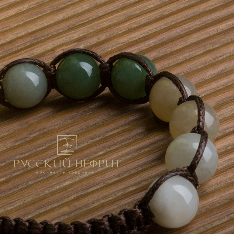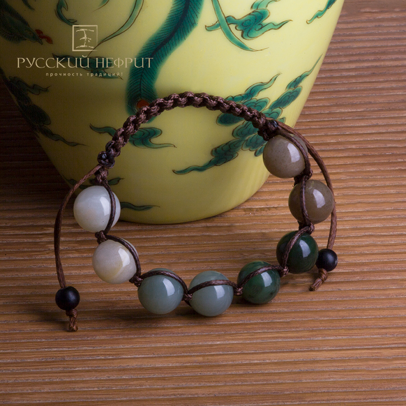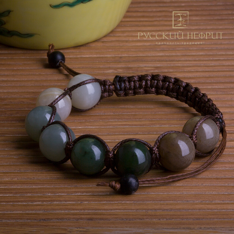 Шамбала в оригинальном исполнении из 8 разноцветных нефритовых бусин диаметром 12 мм. Смелое решение - сочетать пять цветов нефрита в одном браслете навеяно гравюрами с изображением мифической страны Шамбала.