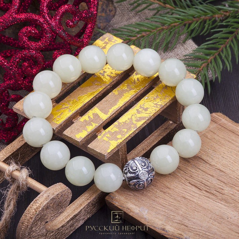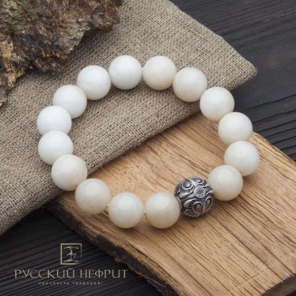 Браслет "Летучая мышь". Белый нефрит. Бусины 12мм