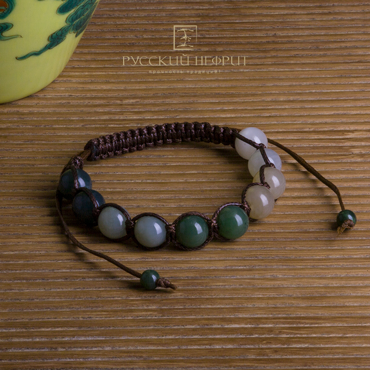 Шамбала в оригинальном исполнении из 10 разноцветных нефритовых бусин диаметром 10 мм. Смелое решение - сочетать пять цветов нефрита в одном браслете навеяно гравюрами с изображением мифической страны Шамбала.
