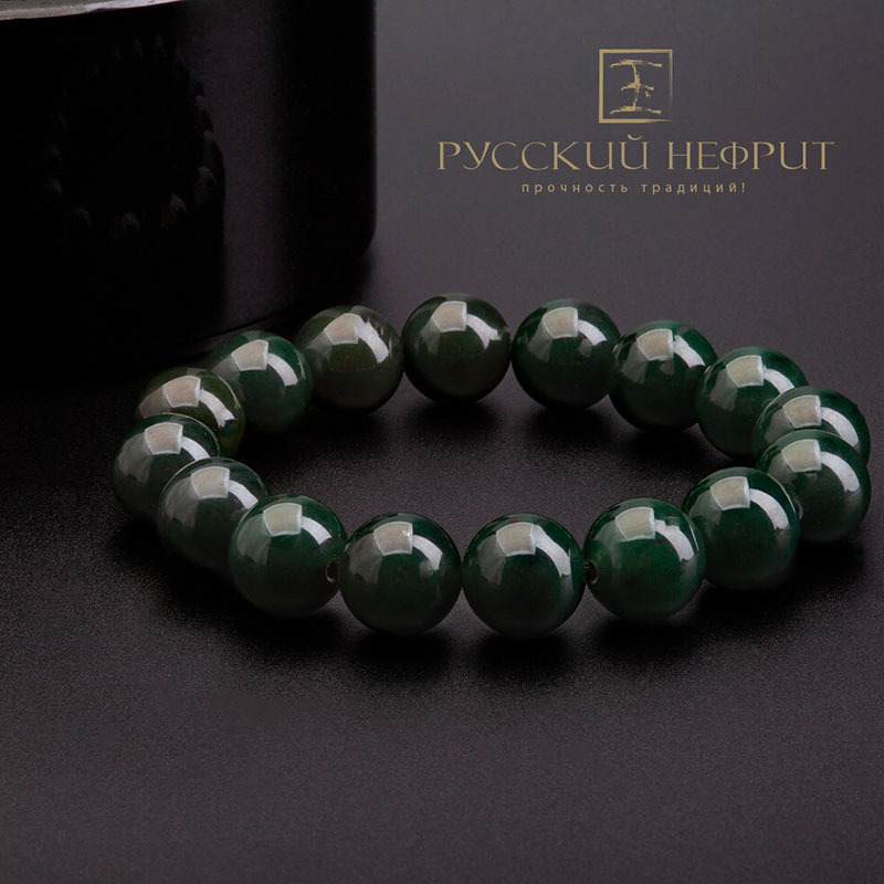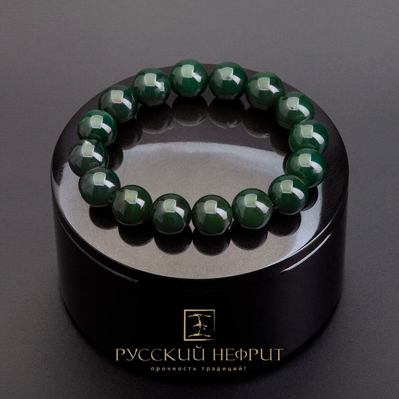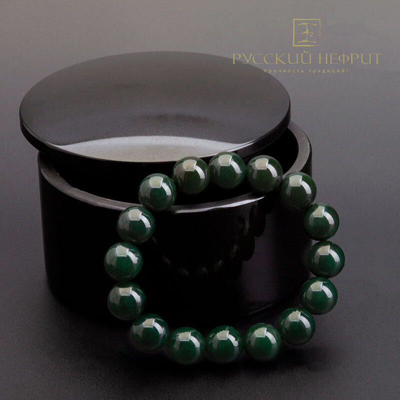 Браслет шарики из тёмно-зелёного нефрита. Д 12мм.