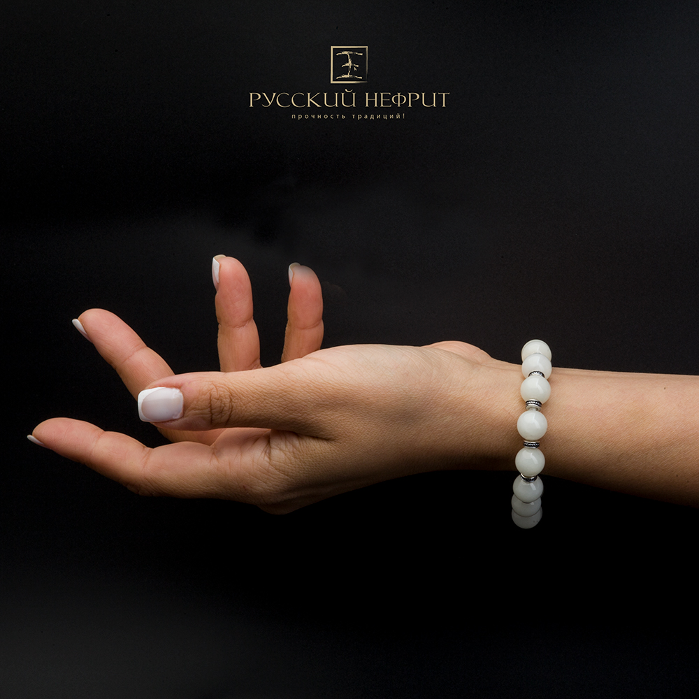 Браслет "Восток" из белого нефрита собран из бусин диаметром 10 мм. и совмещен с разделителями из серебра 925 пробы.