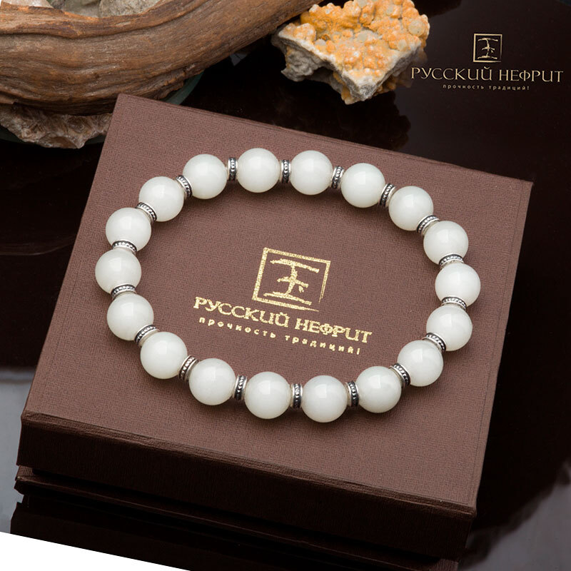 Браслет "Восток". Белый нефрит (бриле). 10мм.