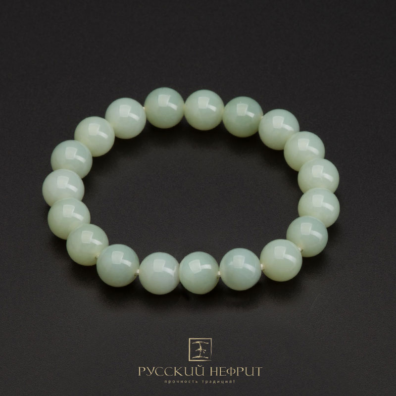Классический браслет из бусин диаметром 10мм ручной работы из натурального нефрита цвета морской волны. Блестящая полировка, нежный пастельный оттенок.