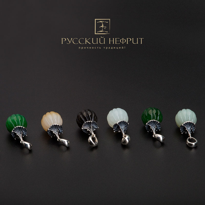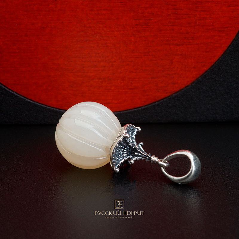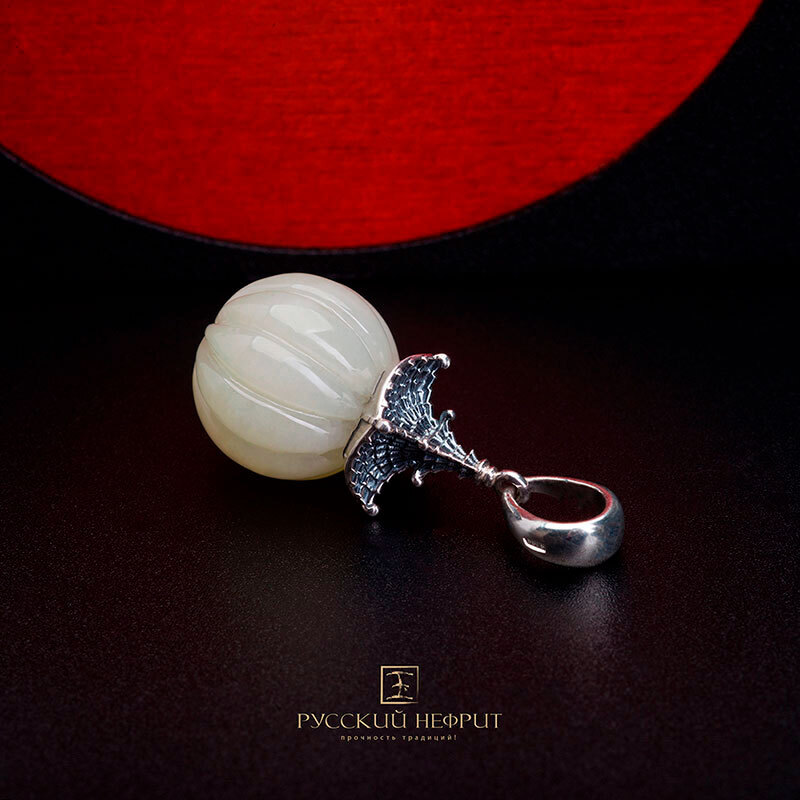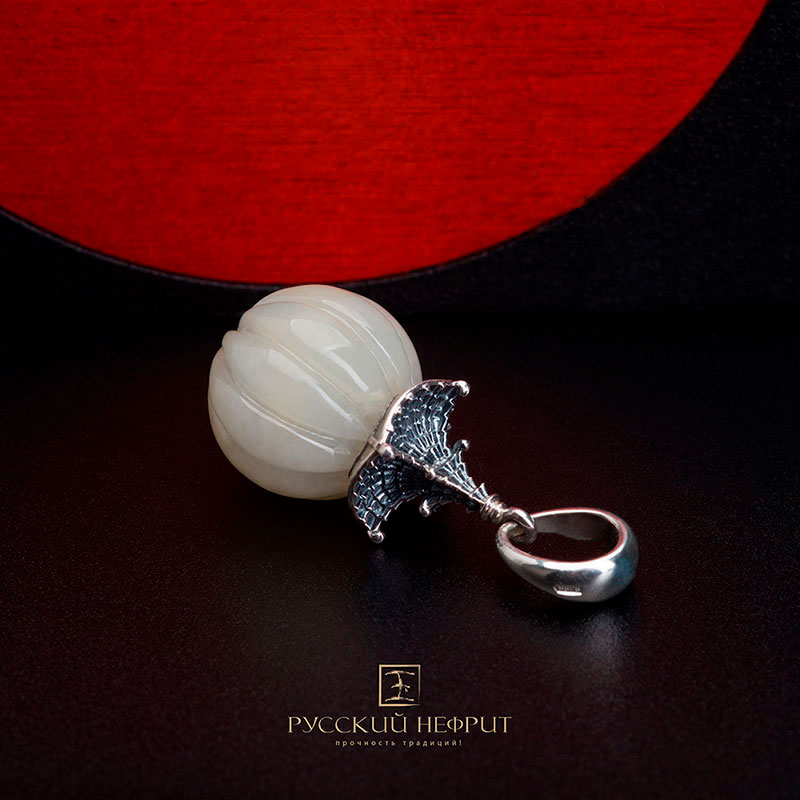 Кулон "Доугун" выполнен из буромского (салатного или яблочного) нефрита и серебра 925 пробы. Эксклюзивный дизайн мастерской Русский нефрит.