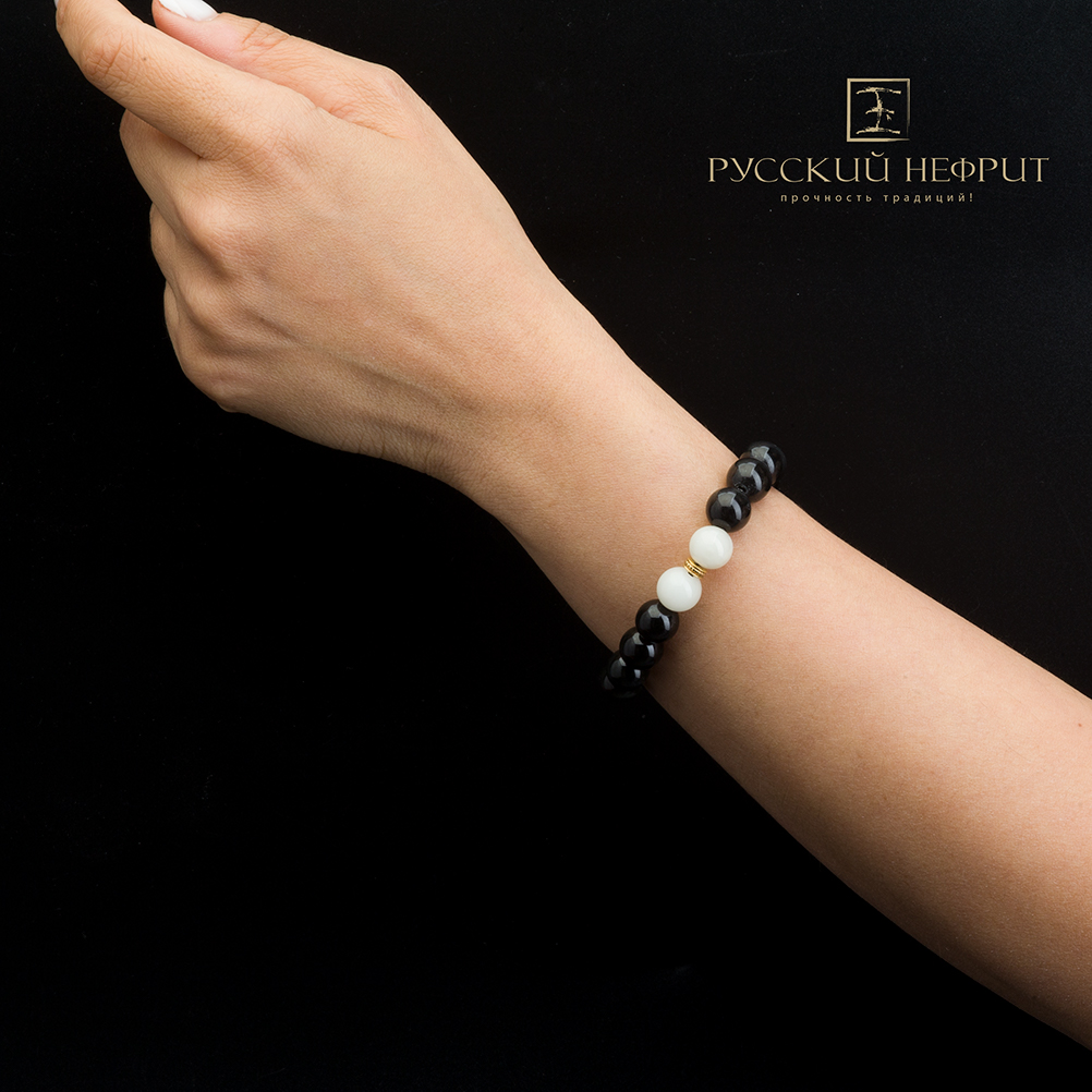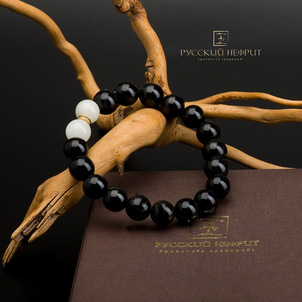 Браслет из бусин диаметром 10 мм. Черный нефрит с белым нефритом и серебряной вставкой из серебря с золочением.