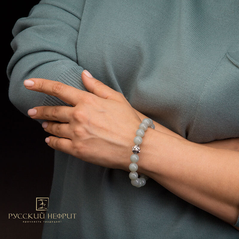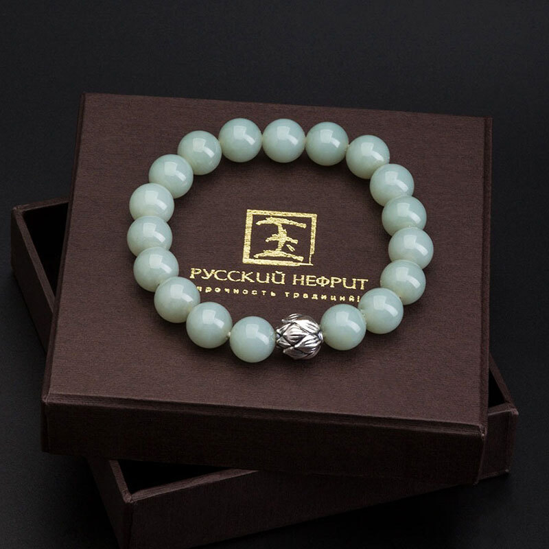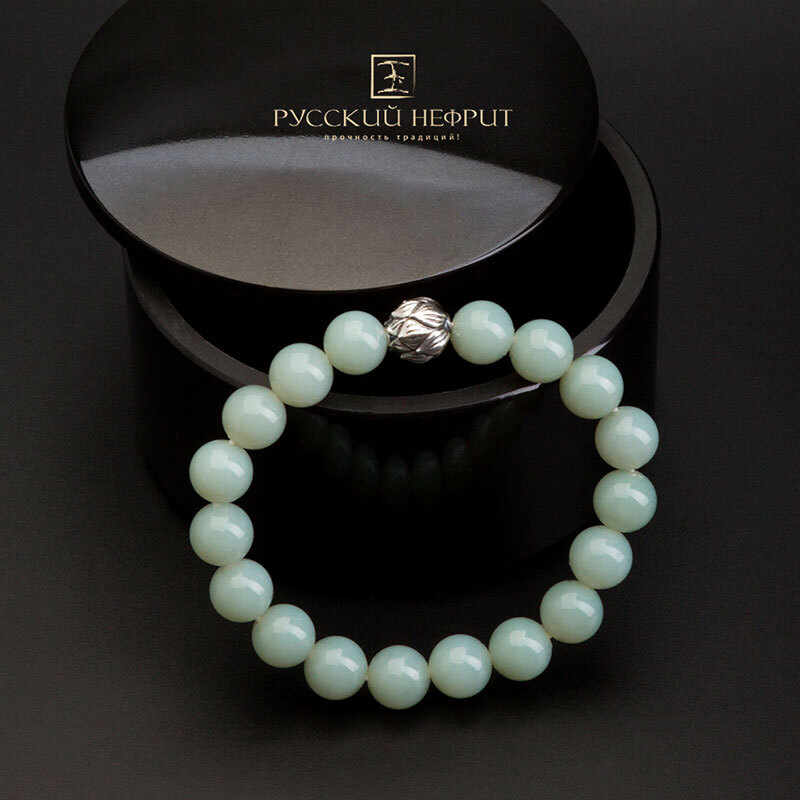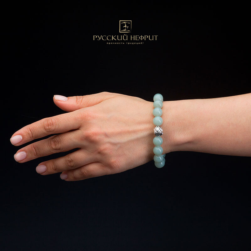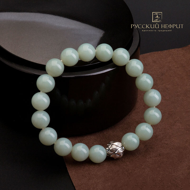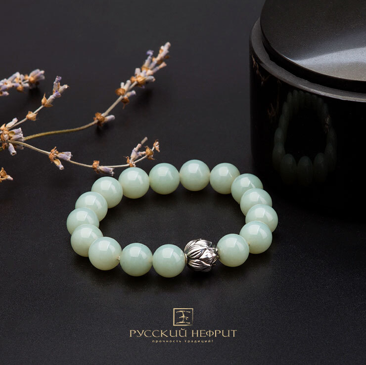 Браслет с Лотосом. Голубой нефрит. Д 10мм.