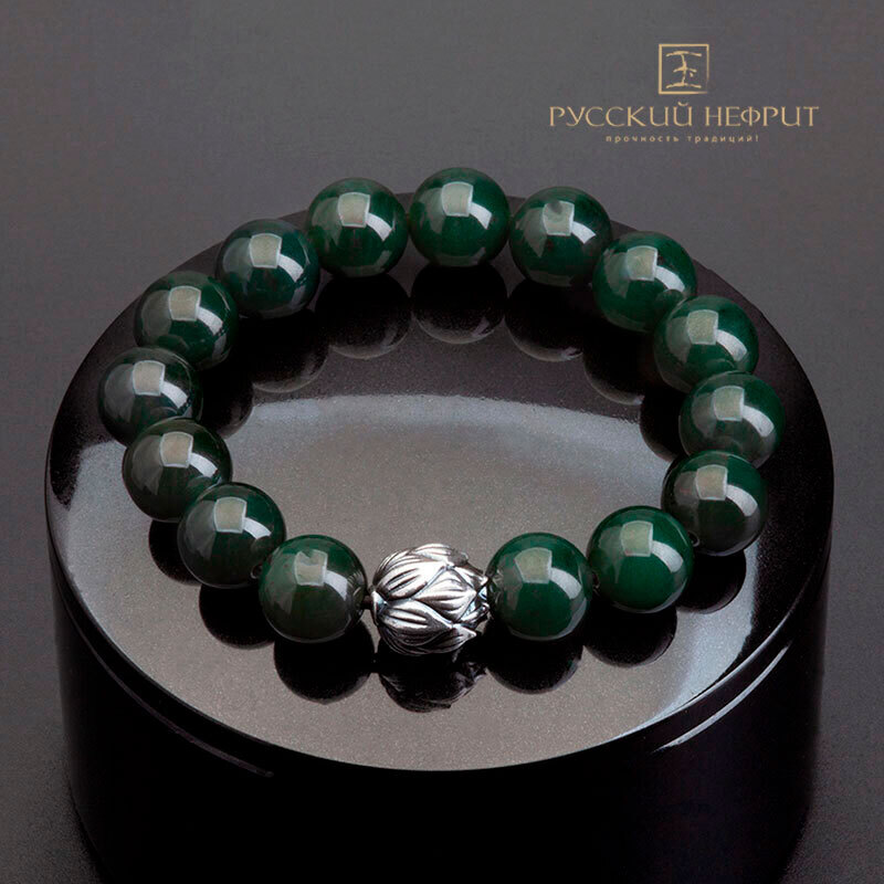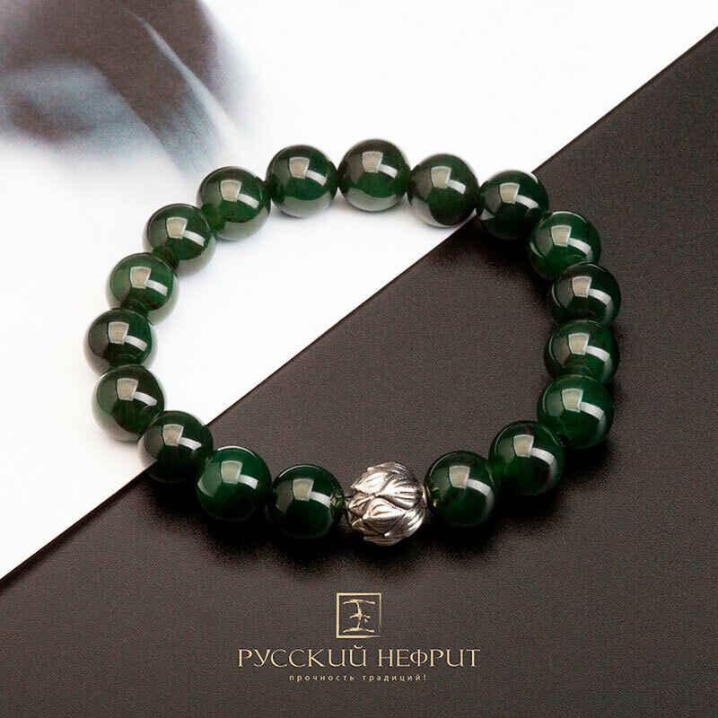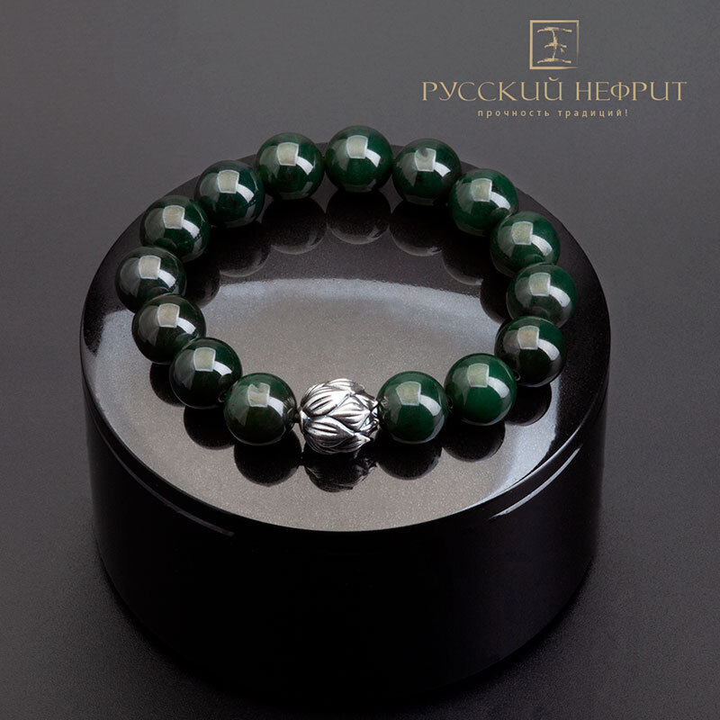 Браслет с бусиной Лотос. Зелёный нефрит. Д 12мм.