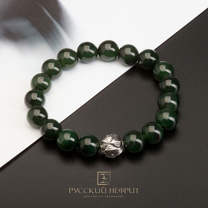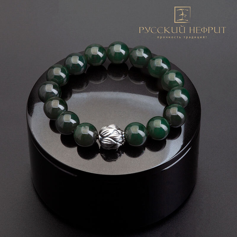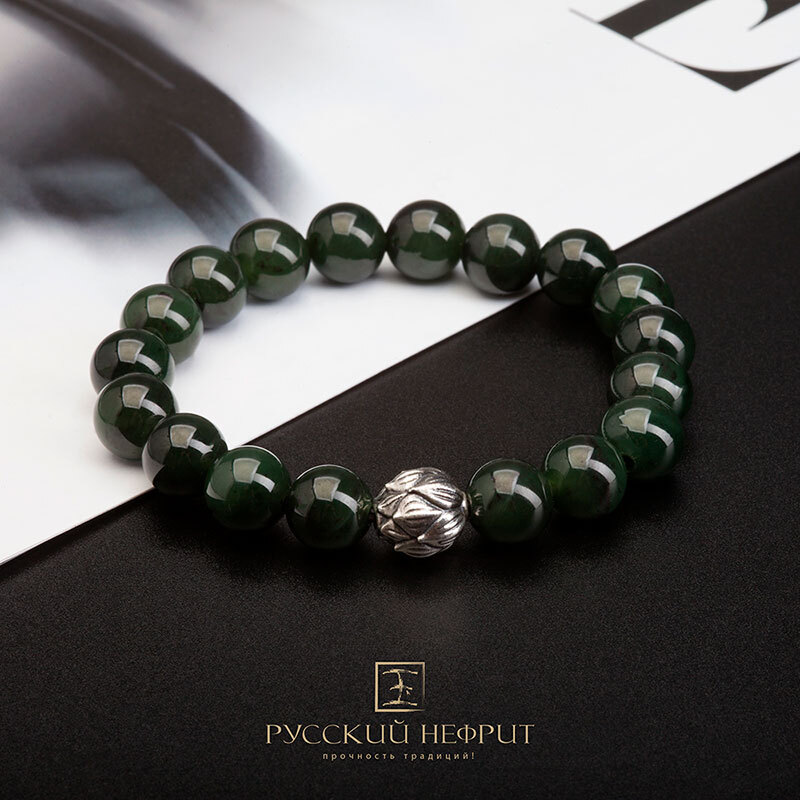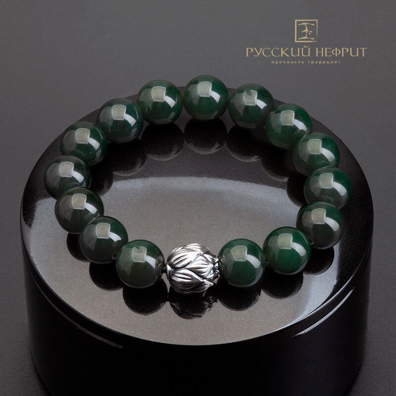 Браслет "Лотос". зелёный нефрит. 12мм.