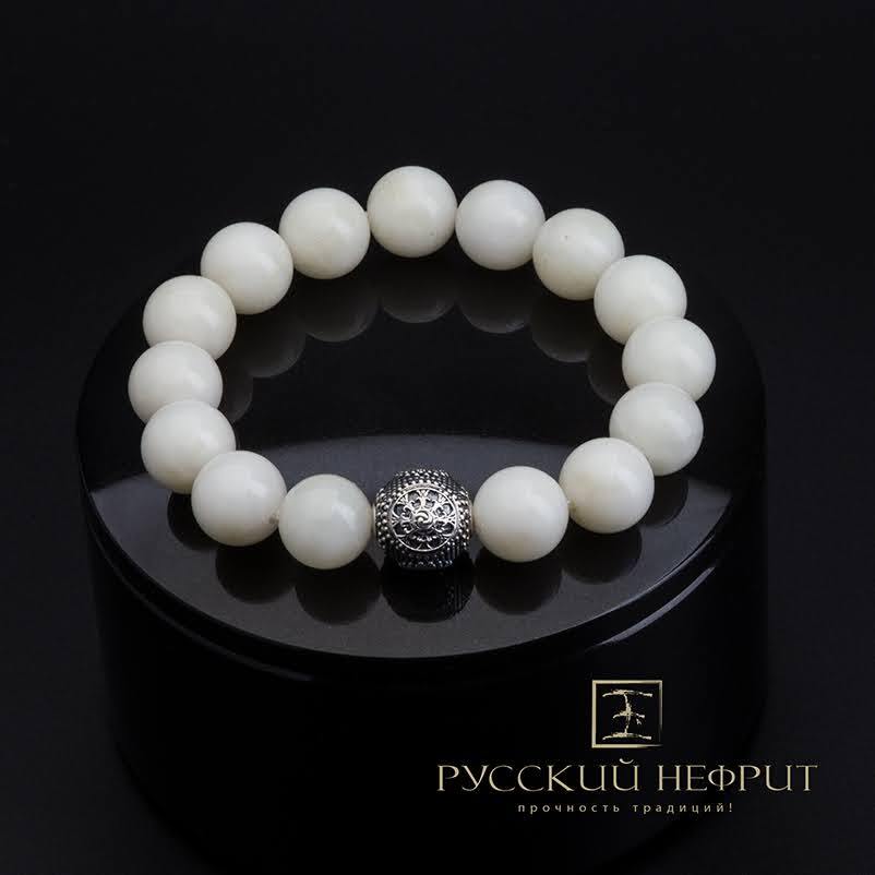 Браслет шарики 12мм из натурального белого нефрита с бусиной из серебра "Колесо судьбы" прекрасное украшение. Подойдёт как современному мужчине, так и женщине.