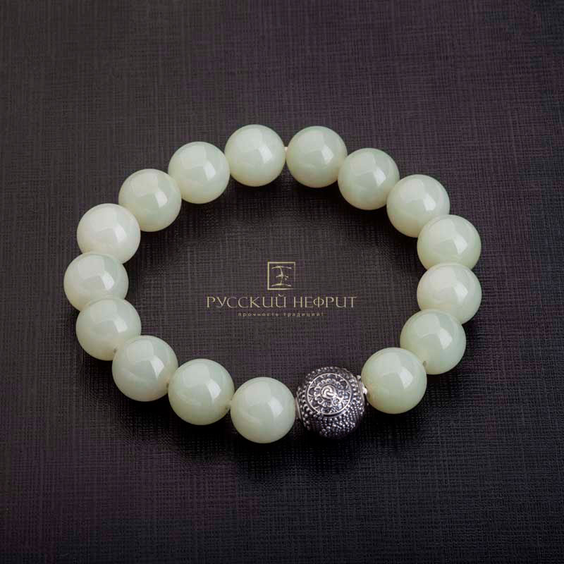 Браслет "Колесо судьбы" из бусин диаметром 12 мм. изготовлен из натурального буромского нефрита. Цвет - светло-яблочный, с легким зеленоватым оттенком, близкий к белому. Вставка из серебра,традиционно-буддийская, — колесо Сансары как символ мироустройства и бытия.