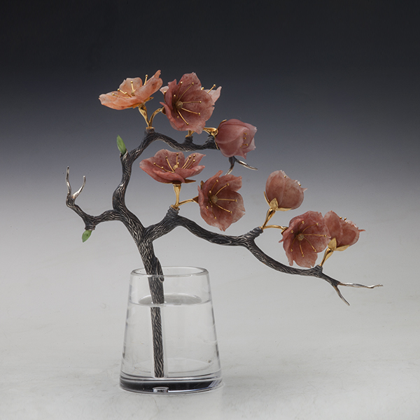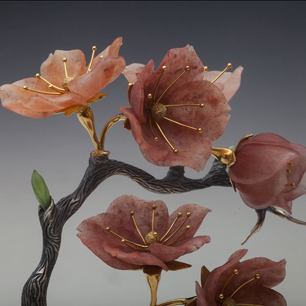 Сакура – символ Японии. Цветение сакуры, когда Япония утопает в бело-розовых цветах - это просто восхитительное зрелище. Некоторые японцы даже передвигаются по стране вслед за цветущей сакурой. Камнерезная композиция «Сакура» - свежая, цветущая, как будто только что сорванная с дерева и помещённая в изящный стаканчик. Это изделие способно удивить и порадовать не только японца, но и любого человека, живущего в гармонии с природой. Сакура – символ чистоты, благополучия, женственности, символ жизни. Веточка сакуры запечатлённая в серебре и камне поистине приумножает эти символы. Тончайшие лепесточки, выполненные из джамбульского халцедона, как живые, но не облетят от дуновения лёгкого ветерка.
