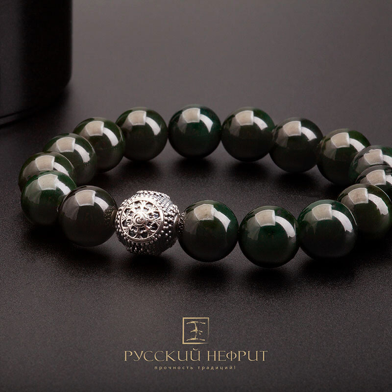 Браслет из зелёного нефрита Колесо судьбы. Д 12мм.