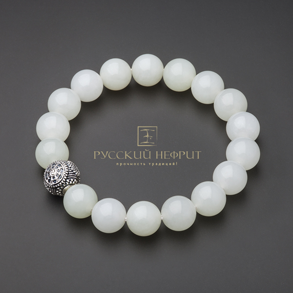 Браслет "Колесо судьбы". Белый нефрит. Бусины 10мм.