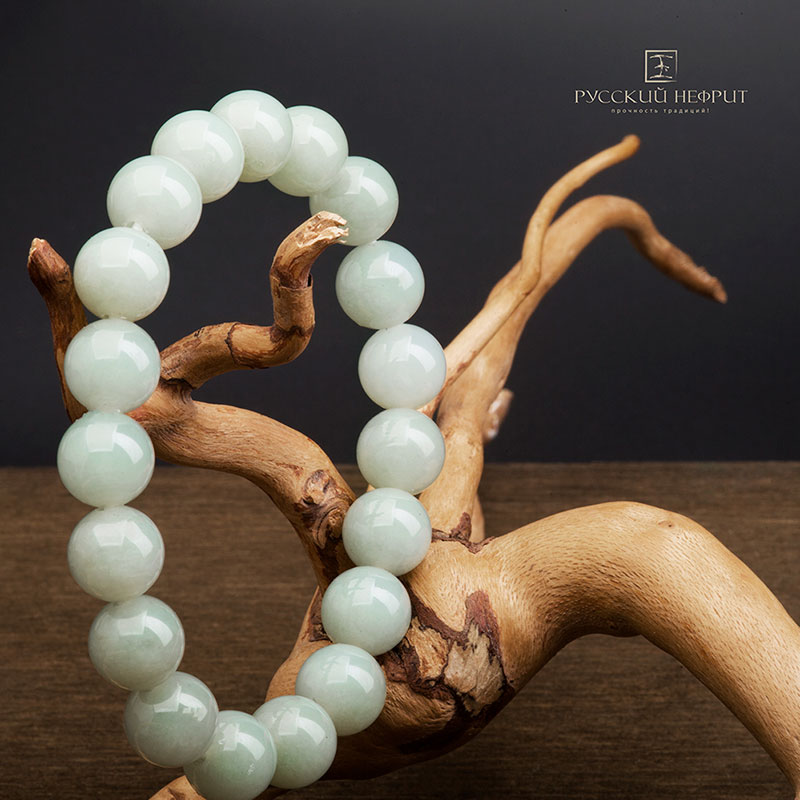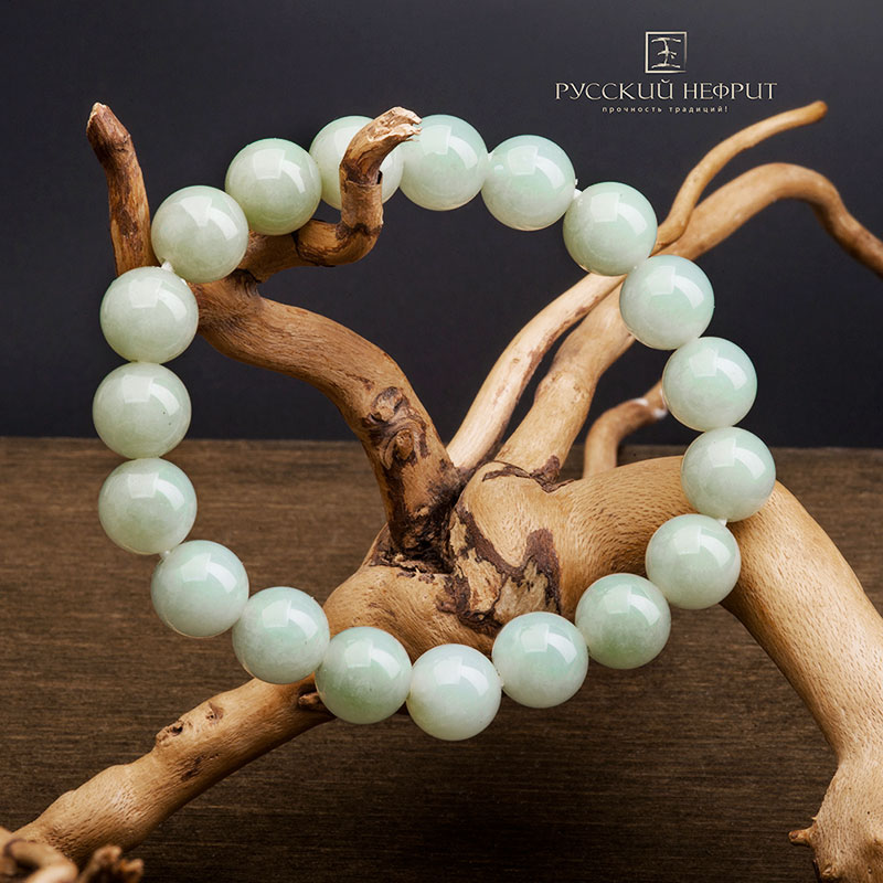Классический браслет из бусин диаметром 10мм ручной работы из натурального нефрита цвета морской волны. Блестящая полировка, нежный пастельный оттенок.
