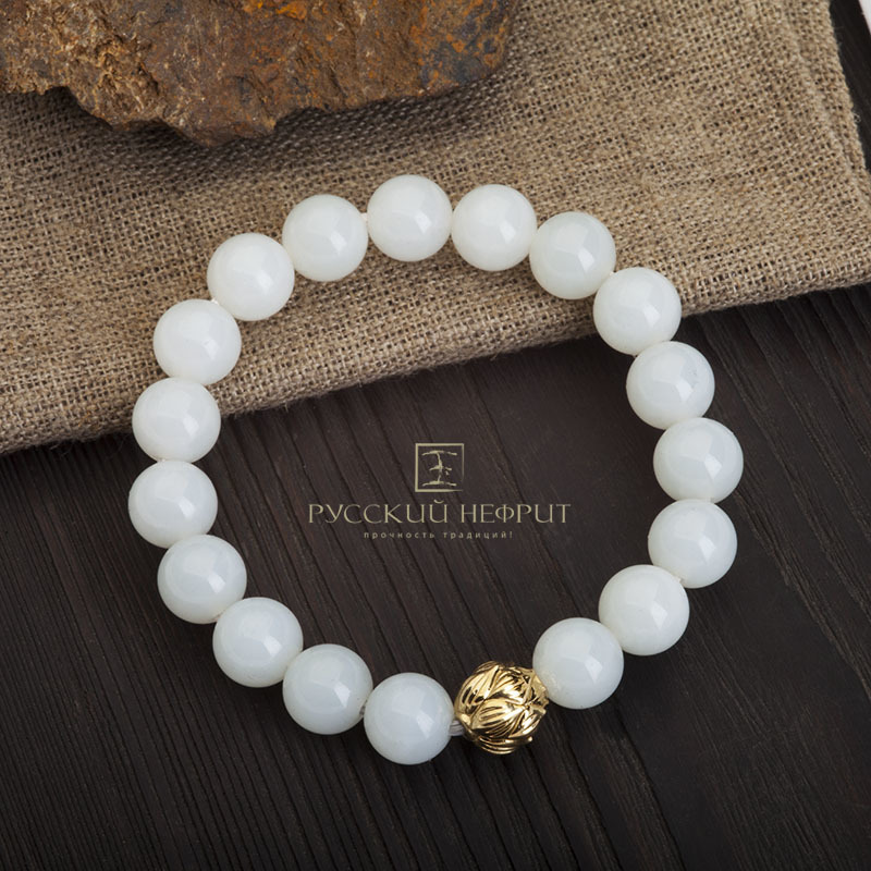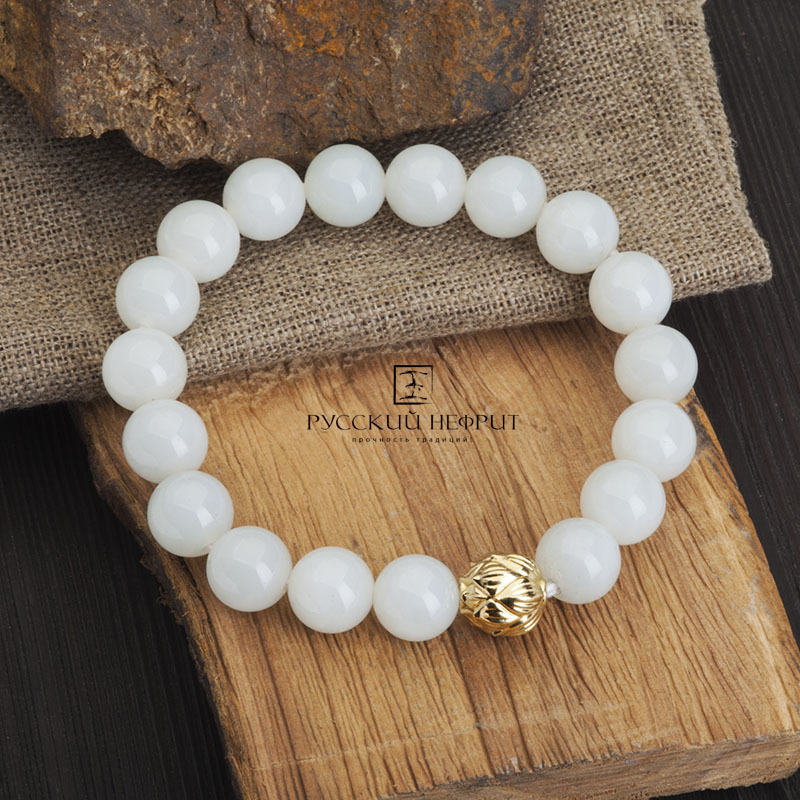 Браслет из белого нефрита "Лотос". Д 10мм.