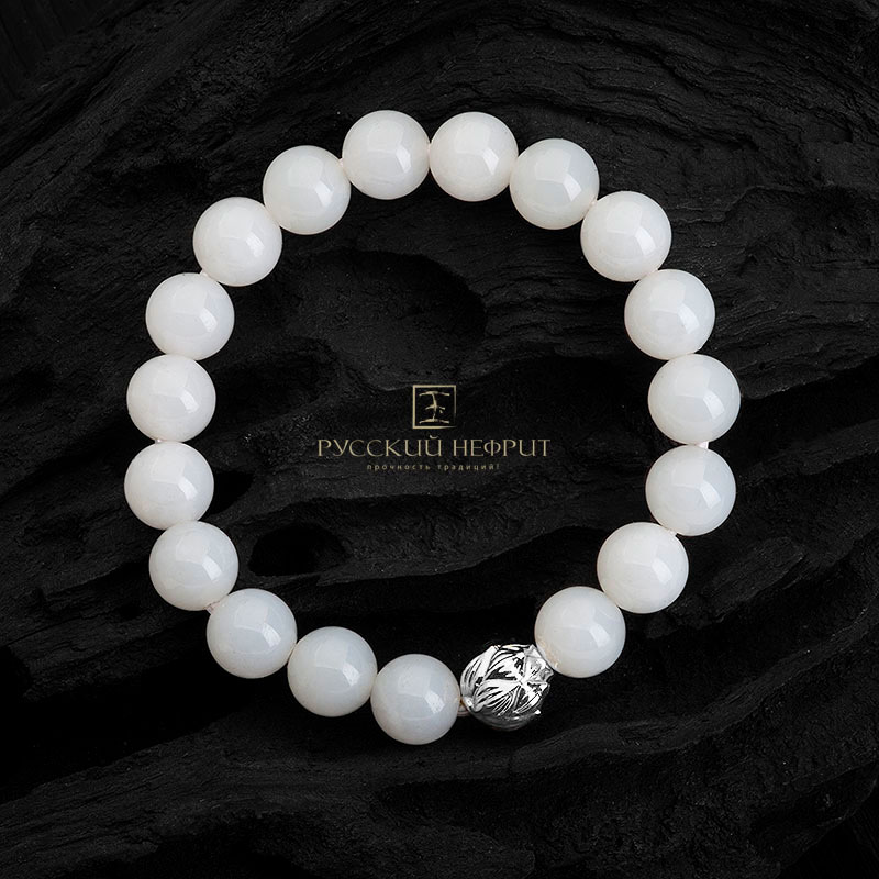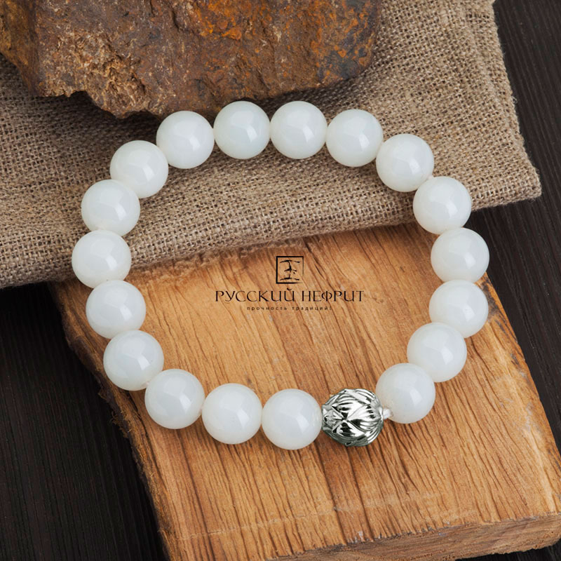 Браслет "Лотос". Белый нефрит. 10 мм.
