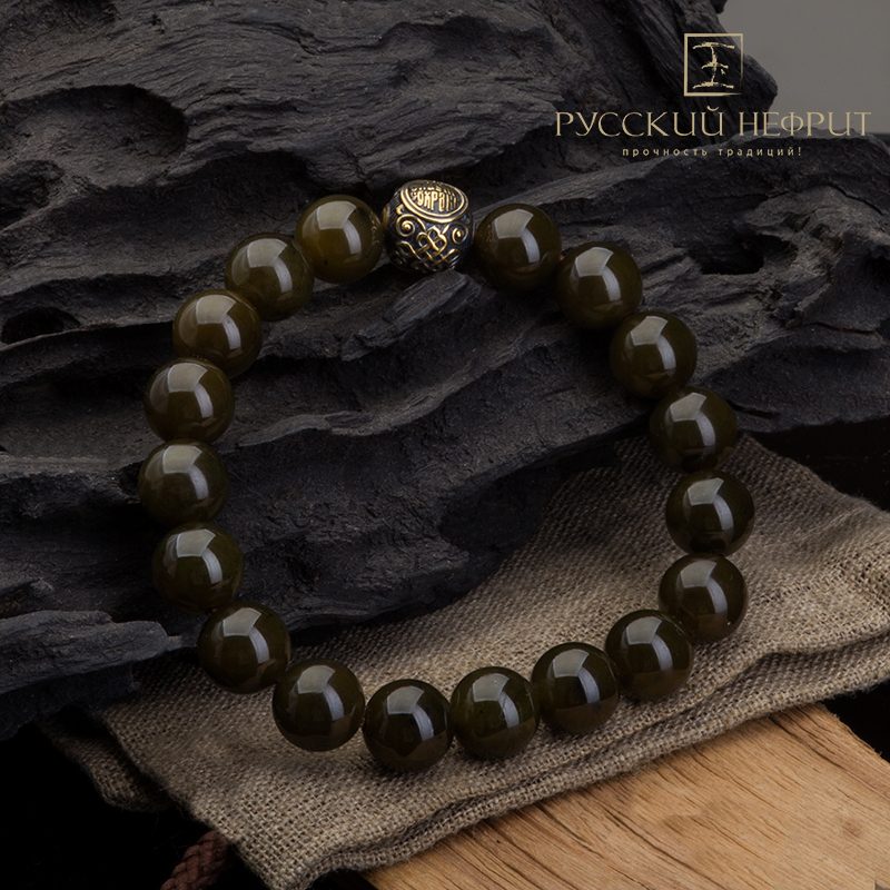 Браслет "Православный". табачный нефрит . Бусины 12мм.