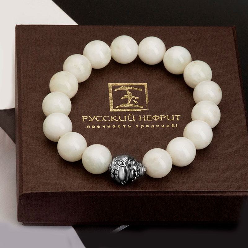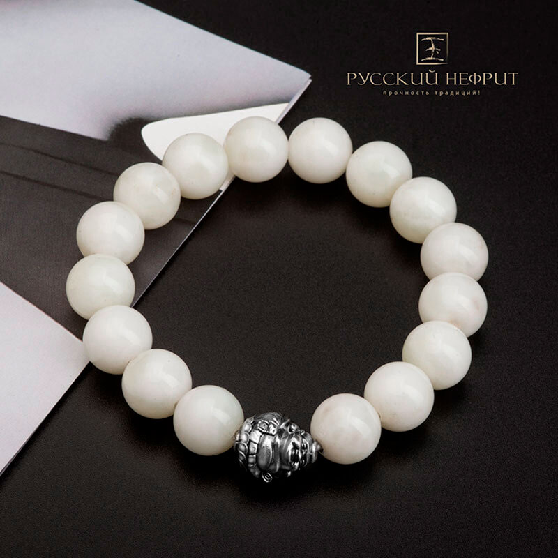 Браслет"Хотэй" из натурального нефрита белого цвета, 12 мм бусины. Бусина из серебра в буддийском стиле.