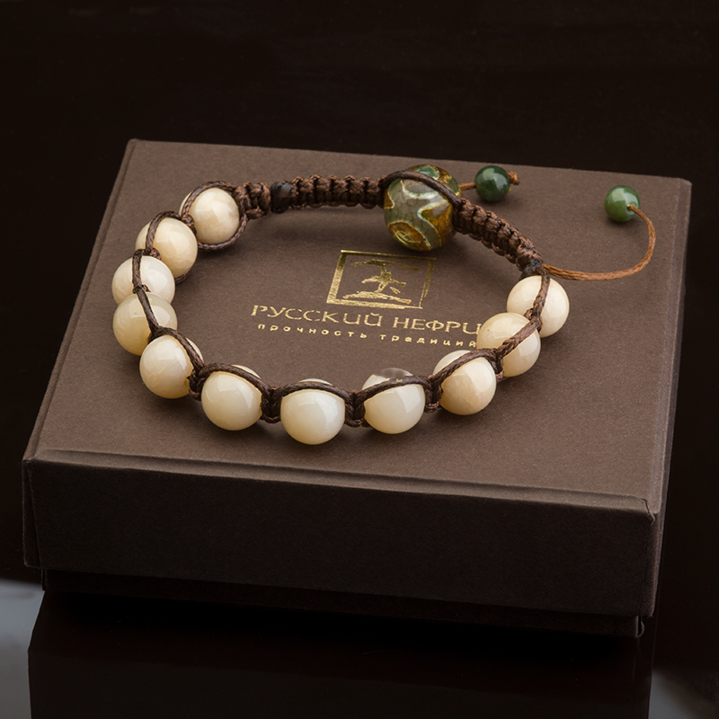 Браслет Шамбала выполнен из 11 нефритовых бусин диаметром 10 мм натурального (цвета слоновой кости) нефрита. Бусины вырезаны вручную из высококачественного сырья. Сплетен браслет специальными узлами из коричневого шнурка, в замок вставлена "Бусина дзи 3 глаза" из агата.