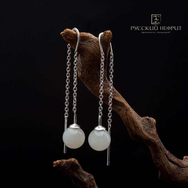 Серьги-протяжки Luna. Серебро, белый нефрит.