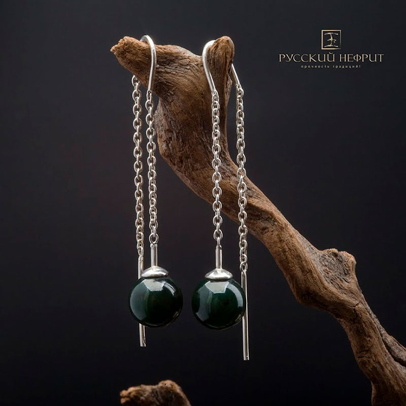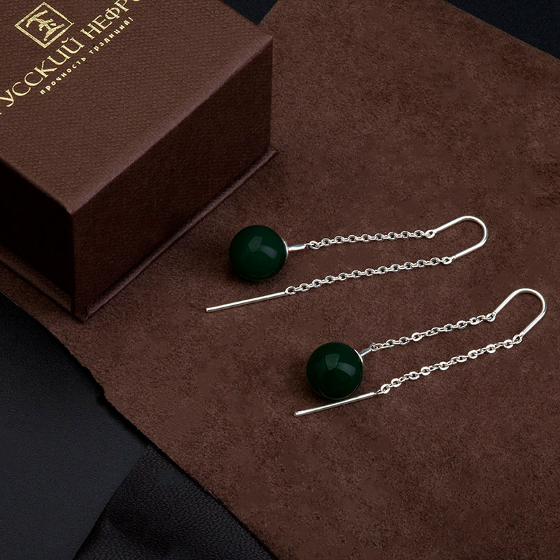 Серьги-протяжки Luna. Серебро, тёмно-зелёный нефрит.