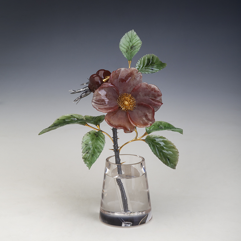 Цветок из камня «Шиповник» от компании «Русский нефрит» — это попытка остановить мгновение. Запечатлеть в камне и металле тот самый момент, когда цветок раскрылся во всей своей красе, чтобы радовать глаз долгие годы.